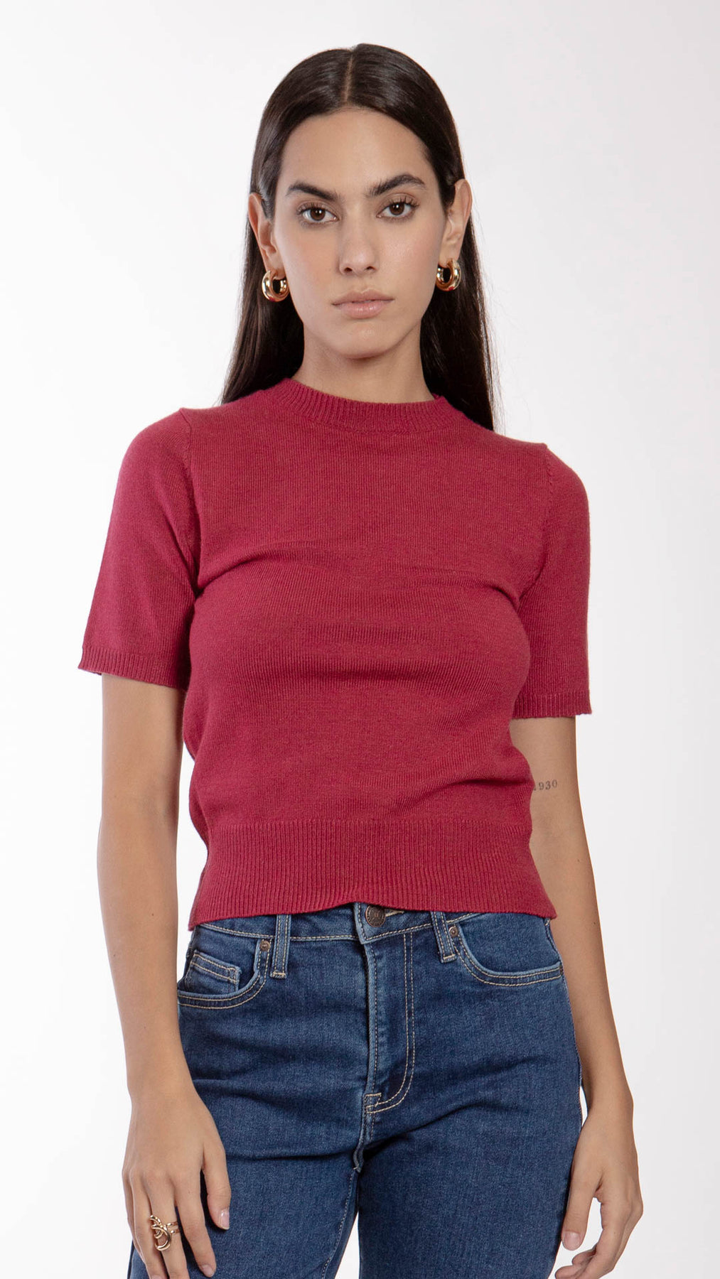 Blusa tejida de manga corta acanalada para mujer B Basic BB0256 en color negro, beige y bugambilia