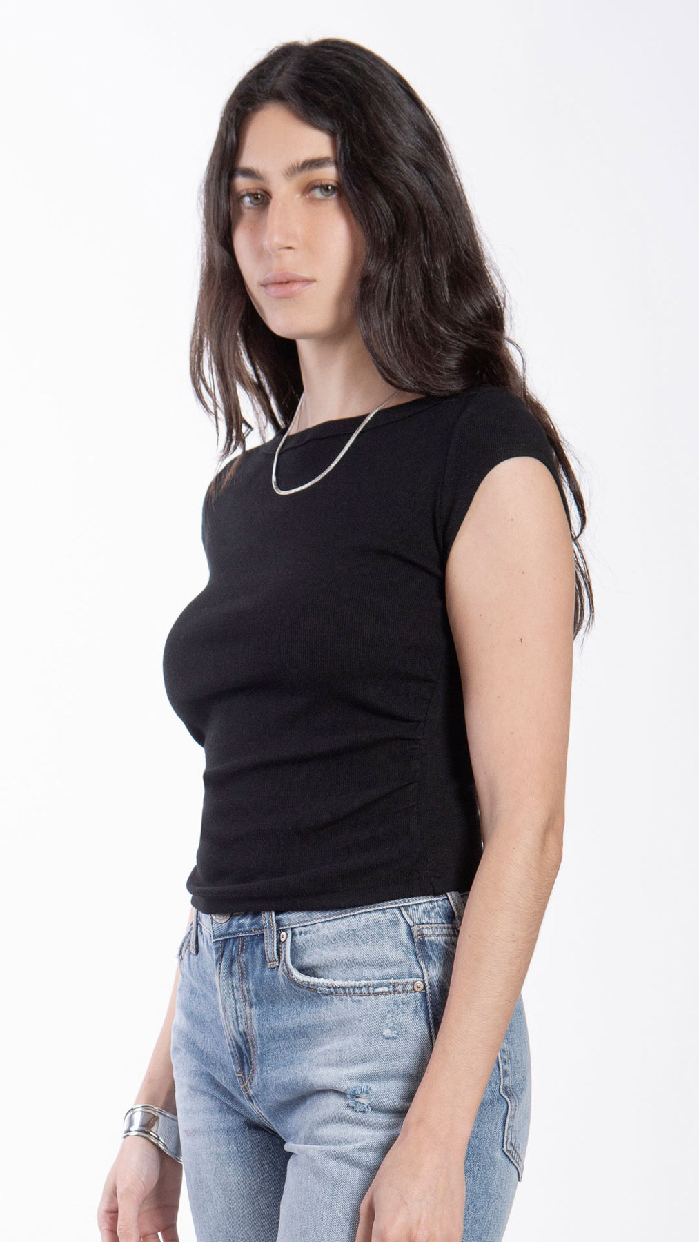 Blusa con manga corta para mujer B Basic BB0312 ajustada con fruncido lateral que estiliza la silueta para ofrecer un look moderno y femenino, en color blanco, beige y negro