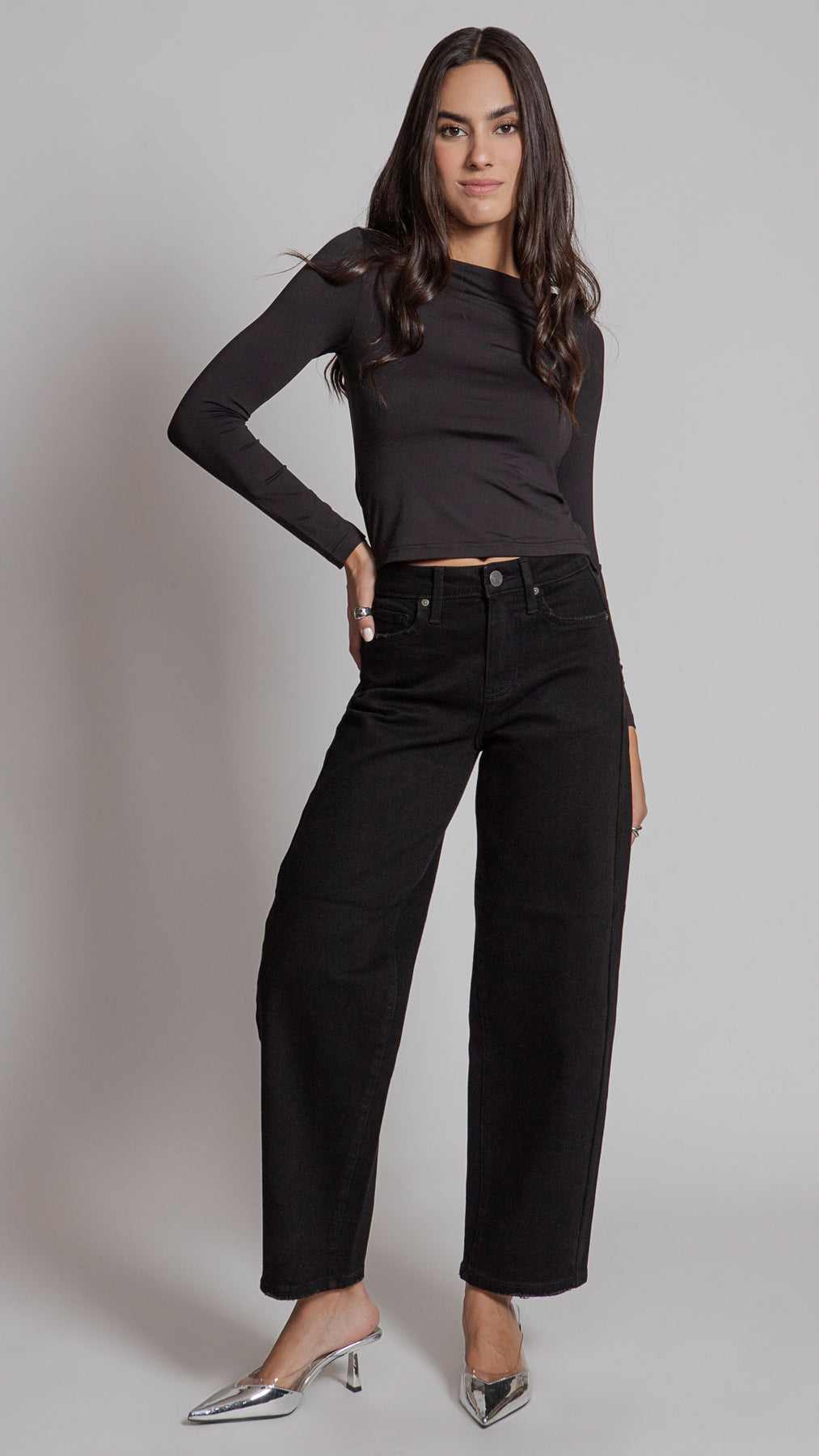 Pantalón barrel de mezclilla básico liso, para mujer Balam BL7266 en color negro. Su corte moderno y cintura alta se adapta de forma natural al cuerpo, manteniendo una caída fluida.