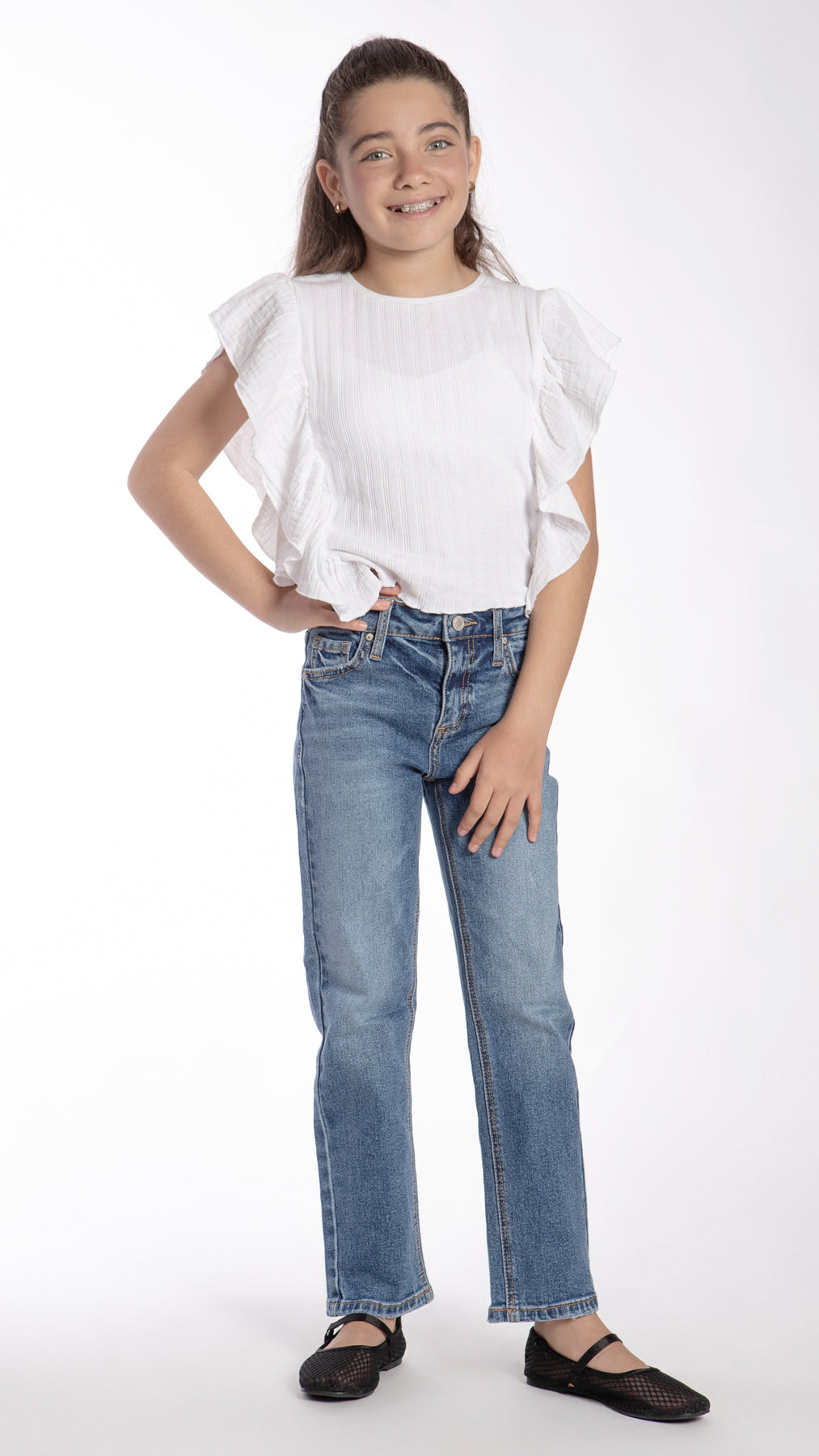 Pantalón straight de mezclilla con deslavado para niña Balam BLK7280 corte clásico que combina con todo en color azul medio
