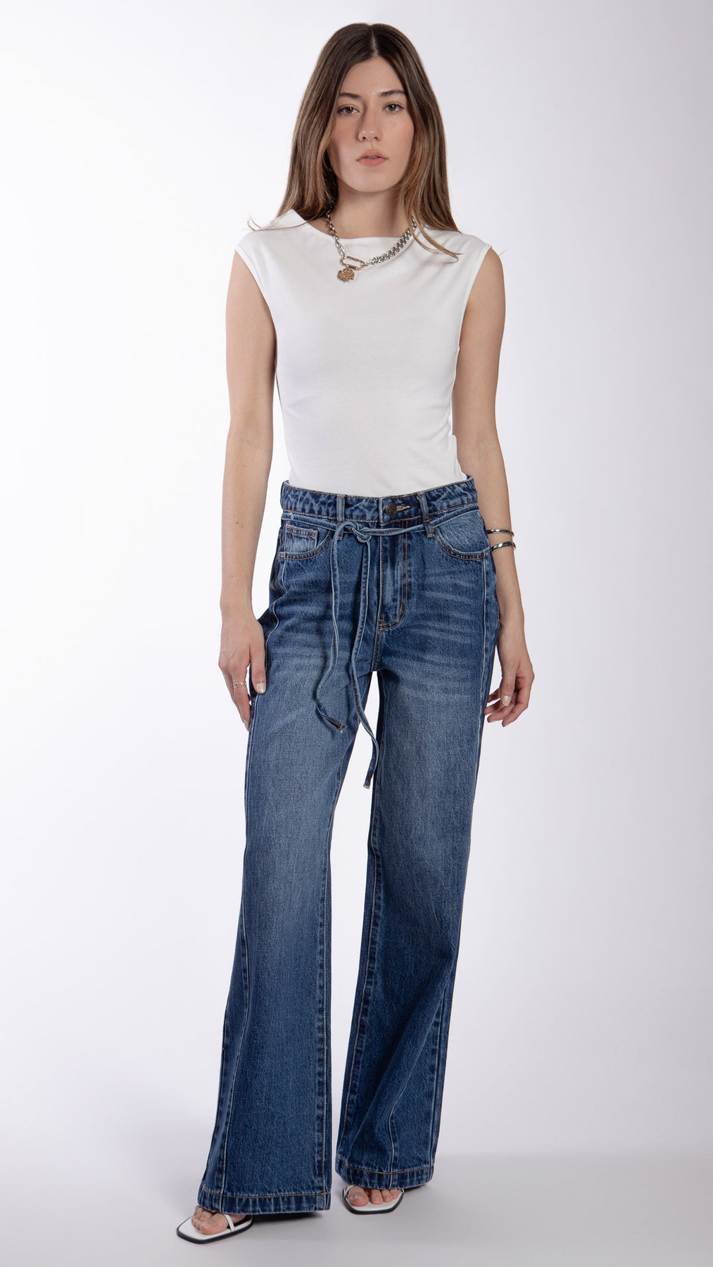 Pantalón vintage loose para mujer Balam BL7500 en color azul oscuro. Este modelo destaca por su fajo integrado con ajuste de lazo, que no solo añade un detalle único y original, sino que también permite adaptar el pantalón a tu medida, resaltando la cintura de forma natural. Además, incorpora costuras marcadas a lo largo de los costados, creando un efecto visual que estiliza la figura y alarga las piernas.
