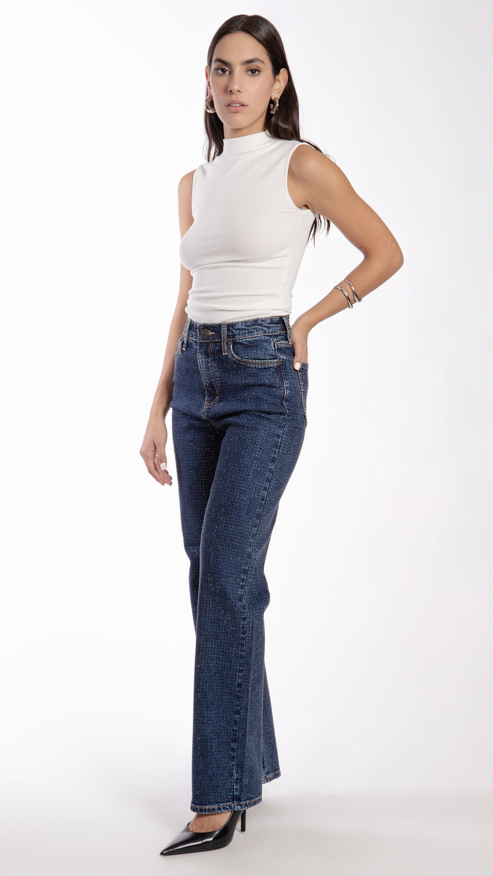 Pantalón wide leg de mezclilla con aplicaciones de cristales en color azul para mujer Balam BL7241 su corte amplio y tiro alto brindan comodidad y estilo en color azul oscuro.