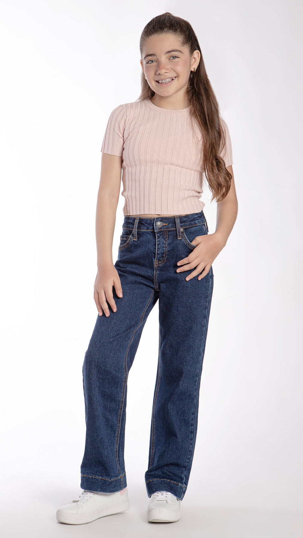 Pantalón wide leg de mezclilla liso con detalle de doblado en bastilla, para niña Balam BLK7274 su corte amplio y tiro alto brindan comodidad y estilo en color oscuro