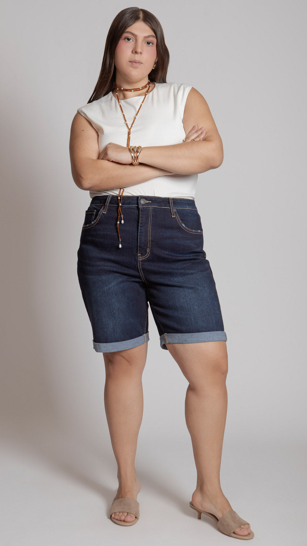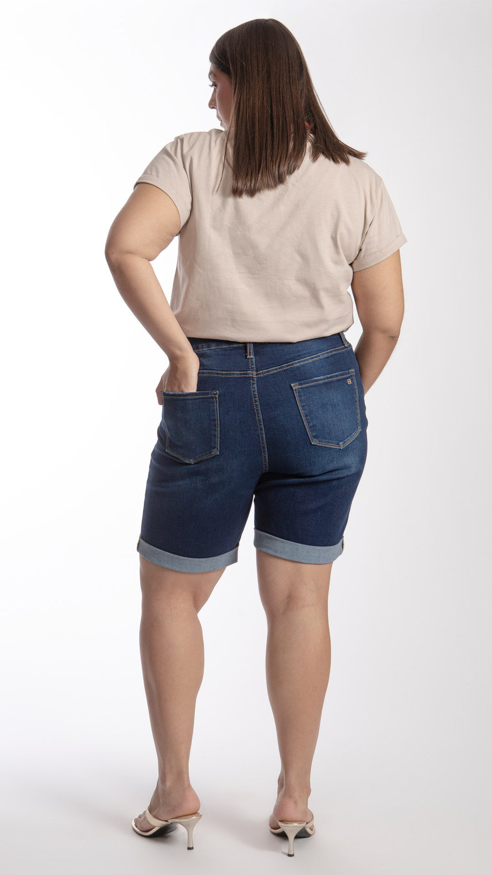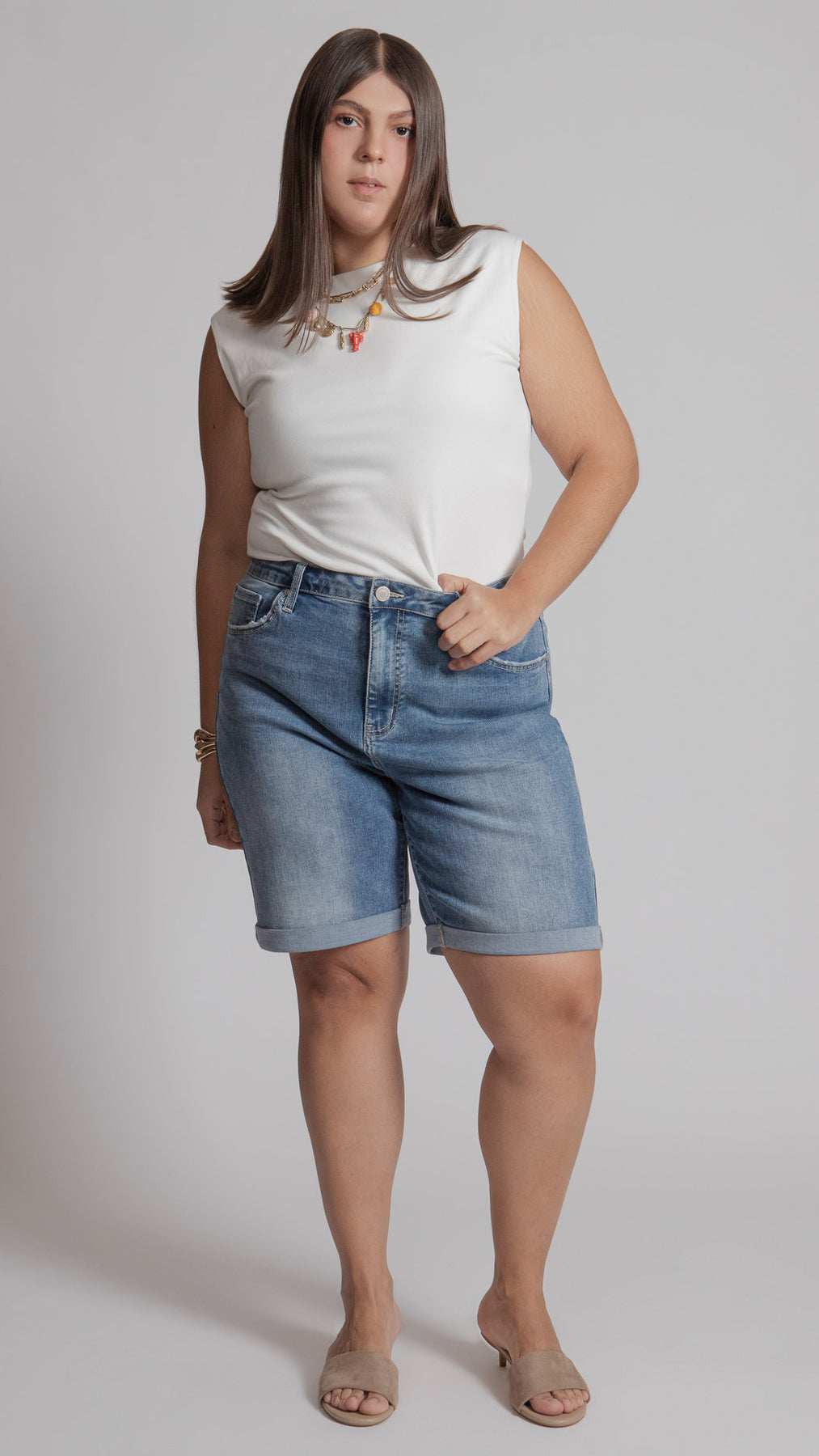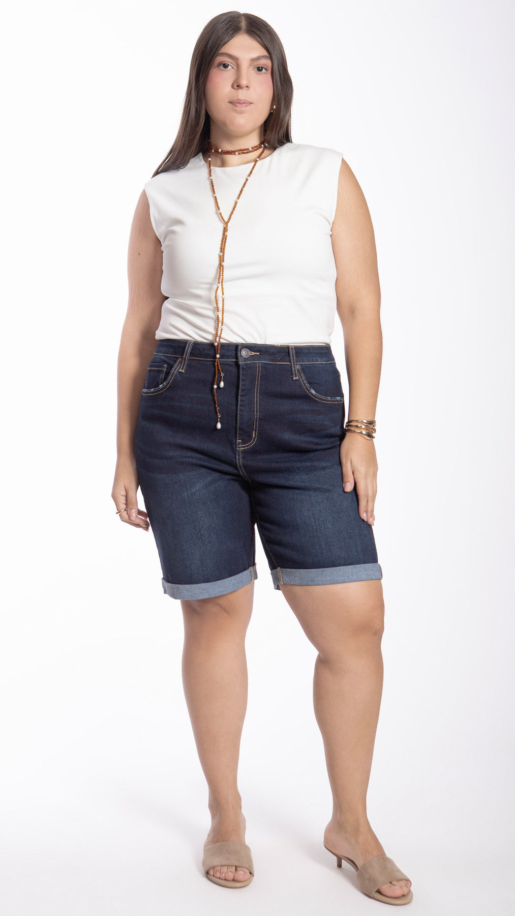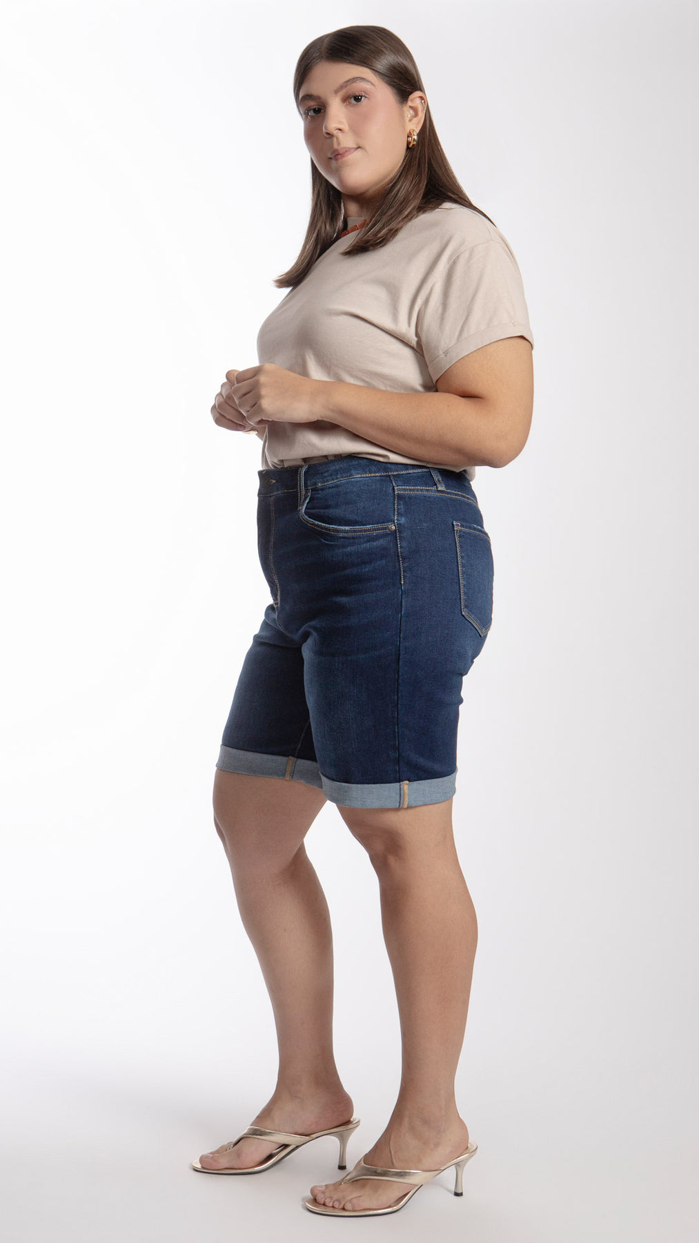 Bermuda con dobladillo marcado en la bastilla curvy Balam BL7402 en color azul claro, índigo y oscuro