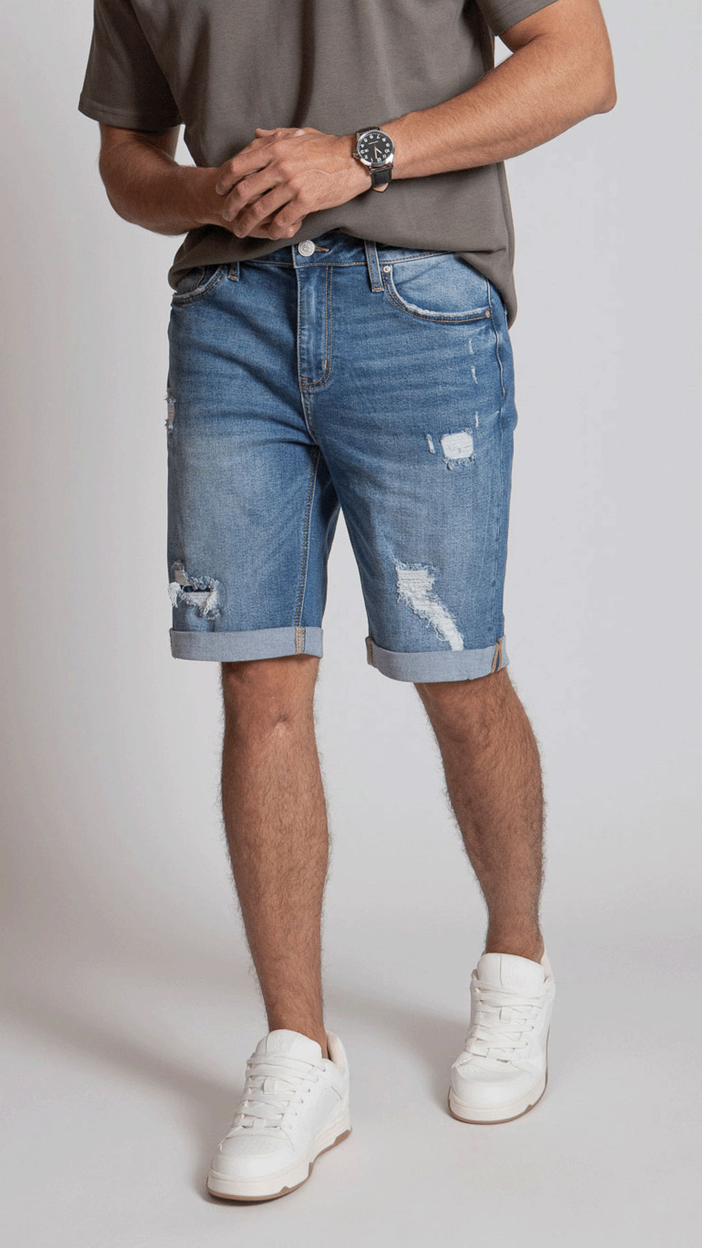 Bermuda para hombre Balam BLC1295 con destrucciones en la parte delantera y detalle de dobladillo en la bastilla en color azul medio.