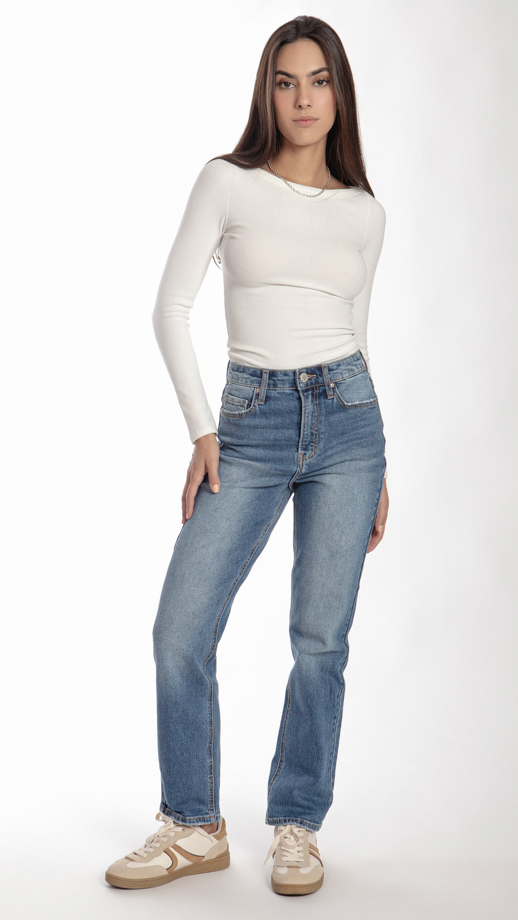 Pantalón straight de mezclilla básico con deslavado, para mujer Balam BL7319 color azul medio. Corte clásico que aporta comodidad y estilo
