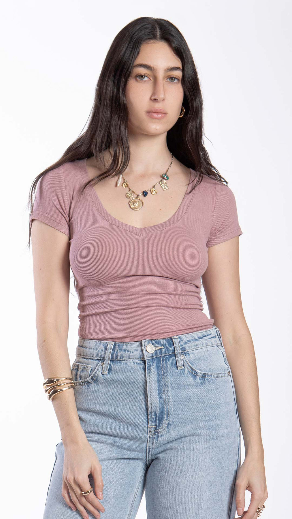 Blusa de manga corta para mujer B Basic BB0290 con escote V para outfit casuales en color blanco, negro, beige, verde y rosa.