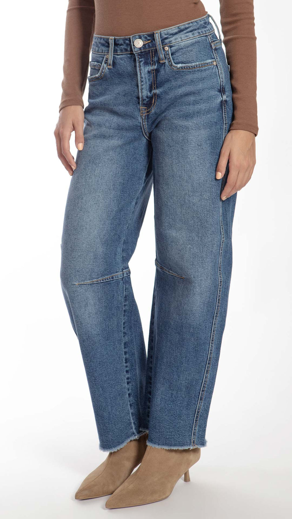 Pantalón barrel de mezclilla con pinzas para mujer Balam BL7292 con tiro alto, se adapta de forma natural al cuerpo, manteniendo una caída fluida en color azul medio