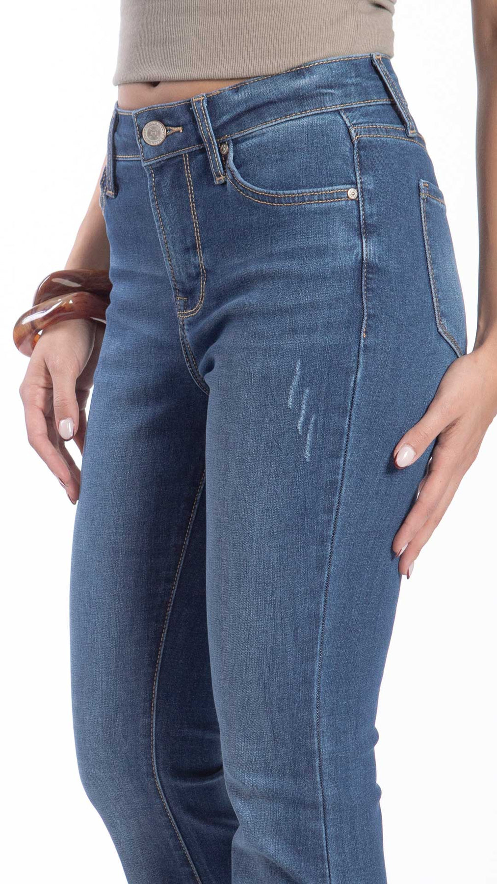 Pantalón flare para mujer Balam BL7491 con pequeños diseños de desgarre en la parte delantera en color azul medio. Su corte ajustado en caderas y amplio en tobillos realza la figura.