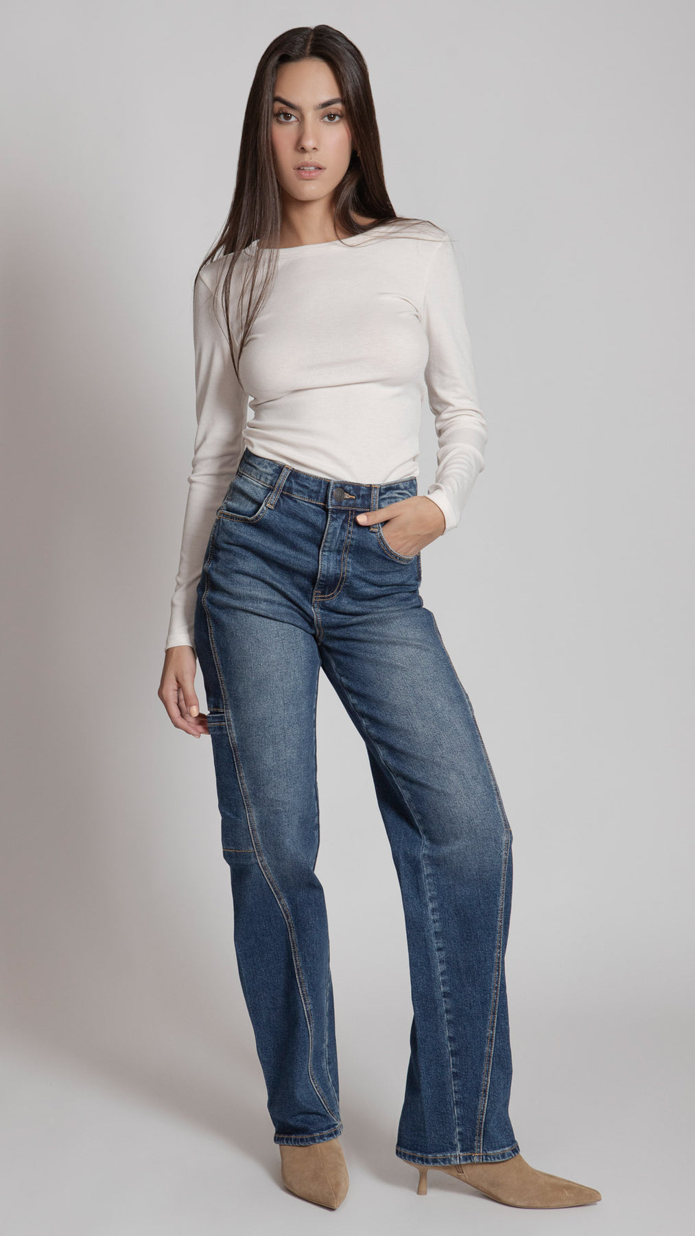 Pantalón wide leg de mezclilla con deslavado y detalle de costuras asimétricas con bolsillo a un costado, para mujer Balam BL7309 color azul oscuro. Su corte amplio y tiro alto brindan comodidad y estilo