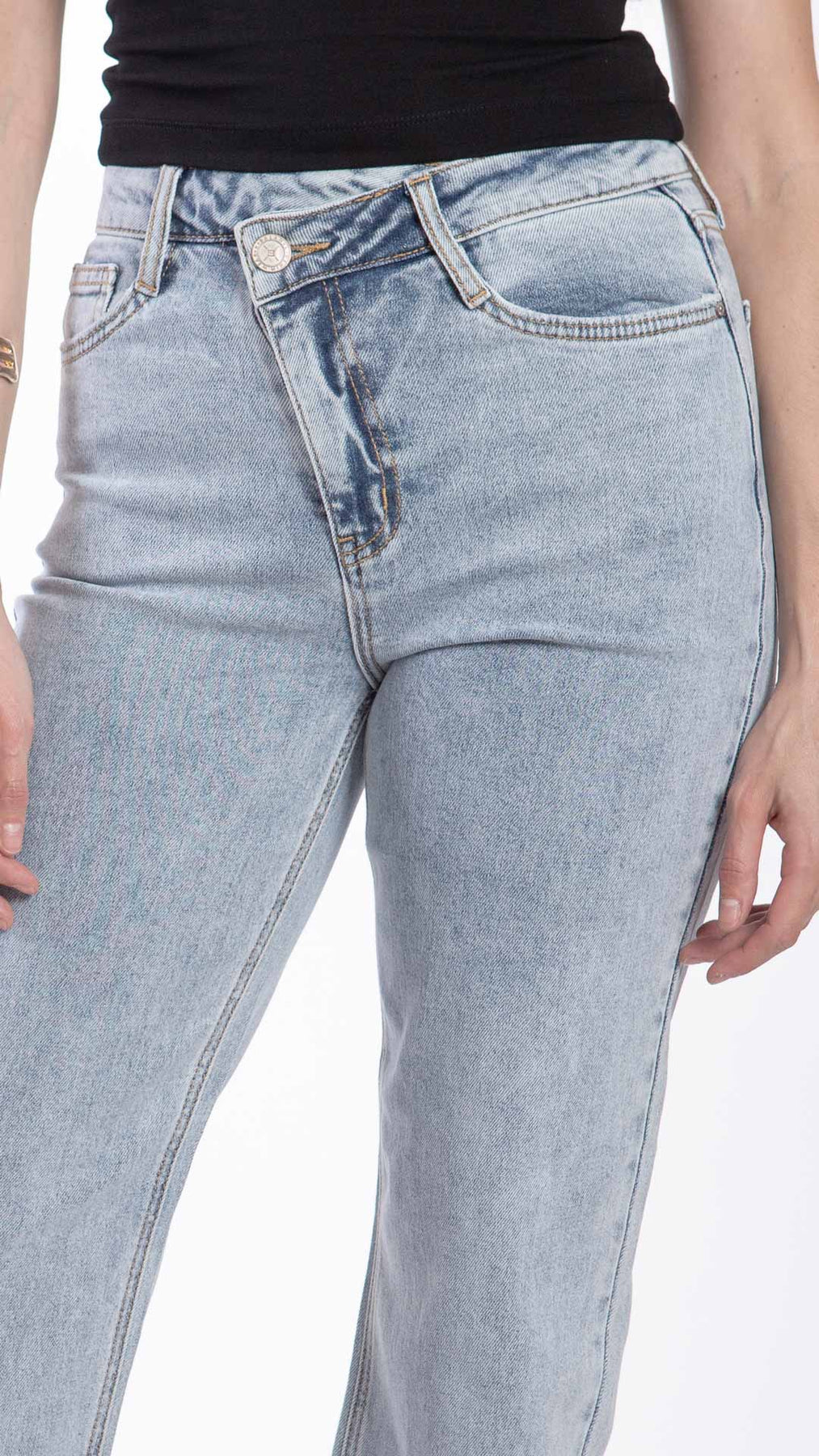 Pantalón wide leg para mujer Balam BL7537 liso con pretina asimetrica y ligero diseño de desgaste al borde de los bolsillos y bastilla en color azul claro