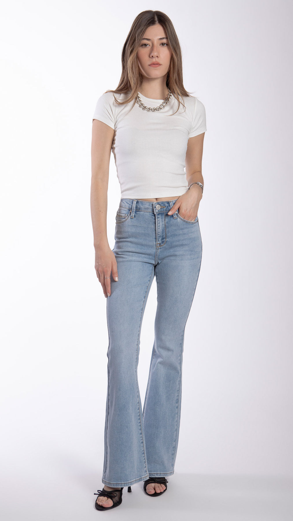 Pantalón flare para mujer Balam BL7524 liso en color azul claro. Su corte ajustado en caderas y amplio en tobillos realza la figura.