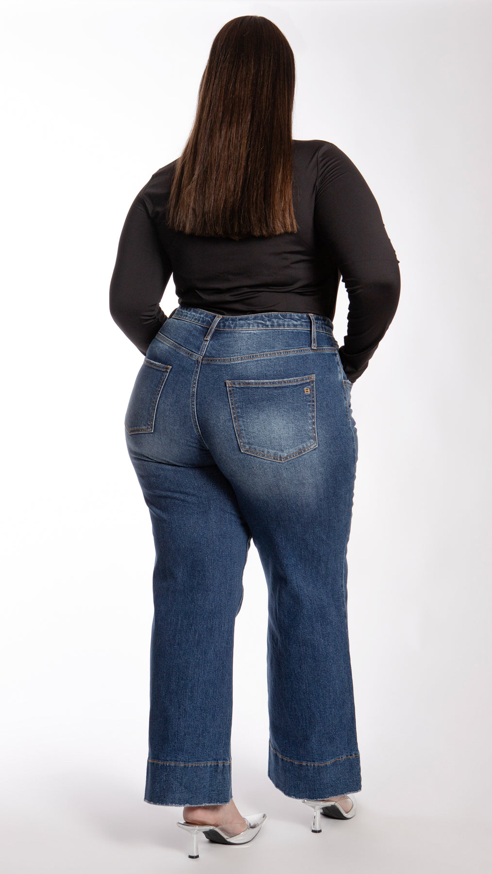 Pantalón wide leg de mezclilla con deslavado y costura ancha en bastilla curvy Balam BLX7276 su corte amplio y tiro alto brindan comodidad y estilo en color azul oscuro