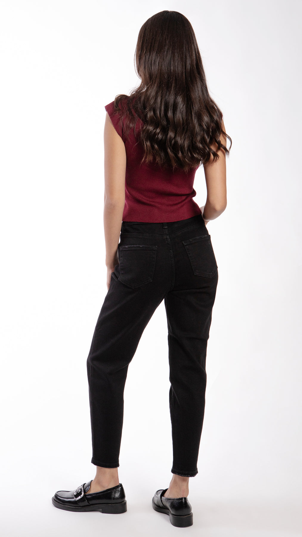 Pantalón mom de mezclilla liso para mujer Balam BL7148, su corte relajado y con mucho stretch lo hace muy cómodo en color negro.