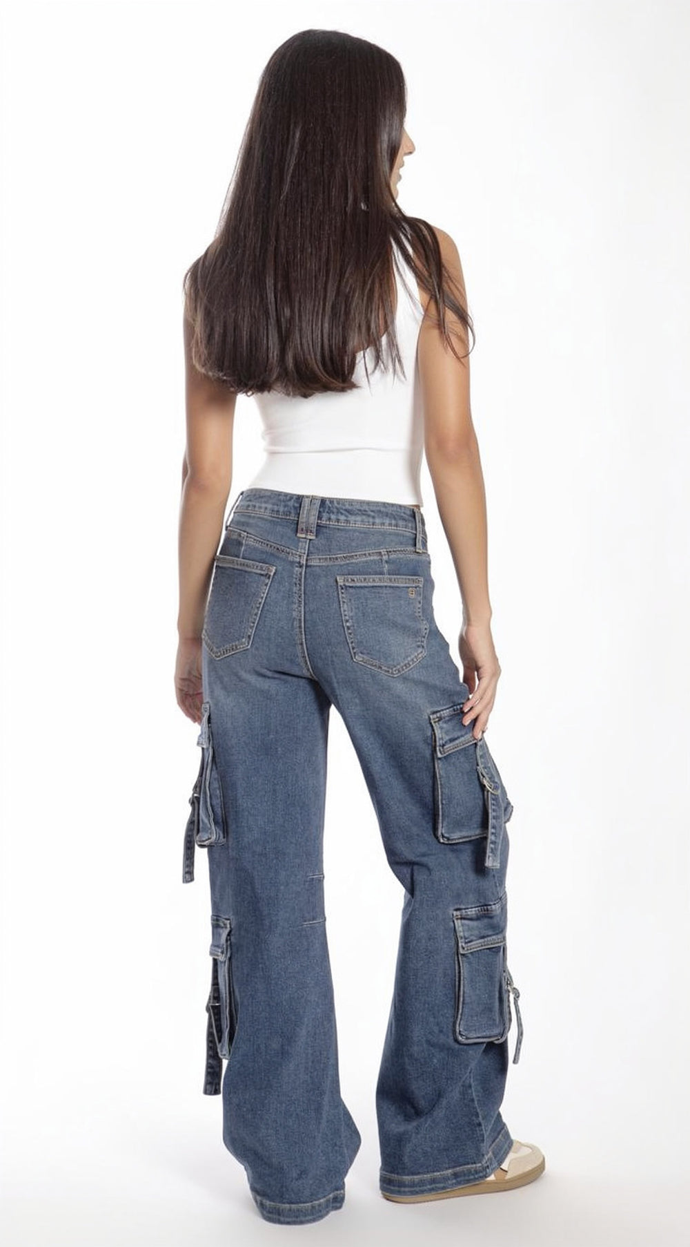 Pantalón vintage loose cargo de mezclilla con deslavado y detalle de pinzas, para mujer Balam BL7299 color azul oscuro. Ajuste amplio que permite la libertad de movimiento.